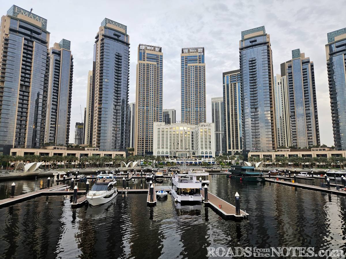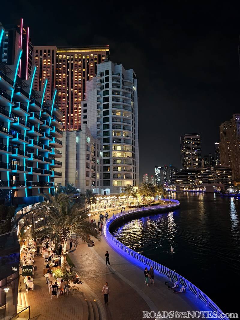 Разходката ни продължи около Dubai Marina – район, изграден около изкуствени канали и луксозни яхтени пристанища. Улиците са чисти и красиво осветени, с много възможности за снимки, отдих и… хапване. Между другото, тази зона много ми напомни за Miami beach, Florida с модерните автомобили по улиците, в комбинация със сгради и заведения с големи надписи и архитектура, напомнящи стил арт деко, измежду другите стилови заемки.