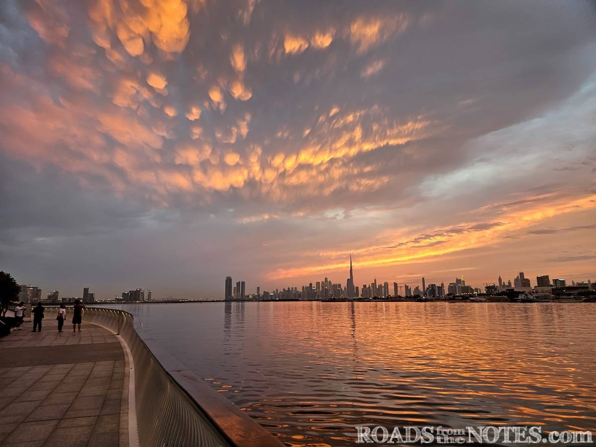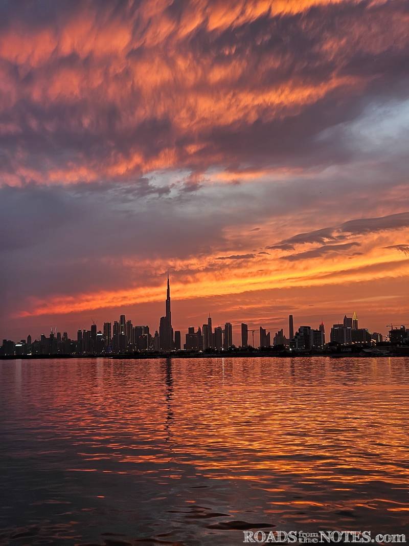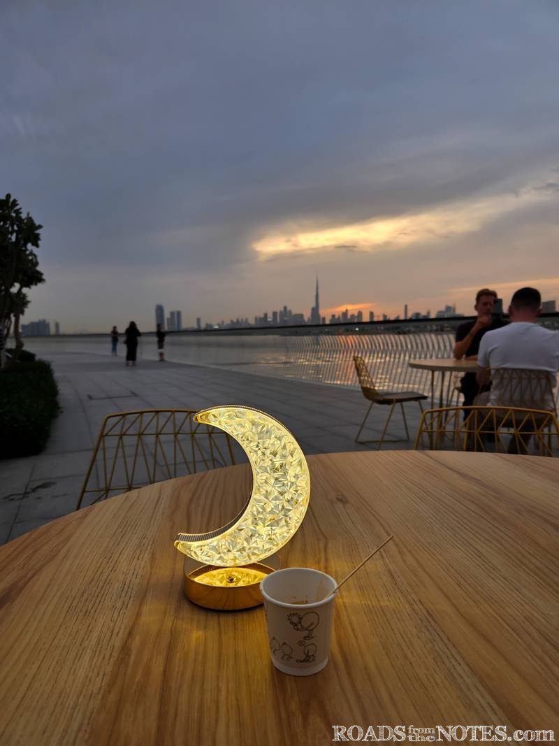 Имахме късмета да попаднем там точно по времето на залеза, когато слънцето се криеше зад силуета на града. В далечината се виждаше Burj Khalifa, а светлините на небостъргачите започваха да се запалват една по една. Седнахме край водата на кафе и просто се насладихме на момента.