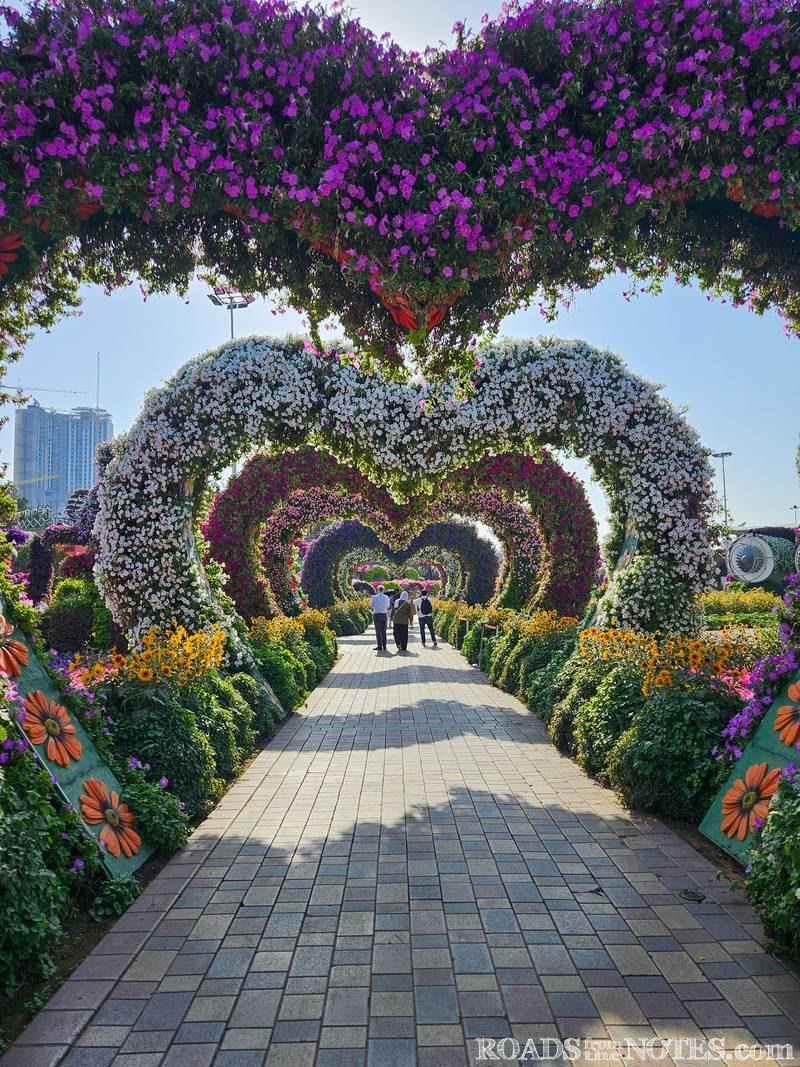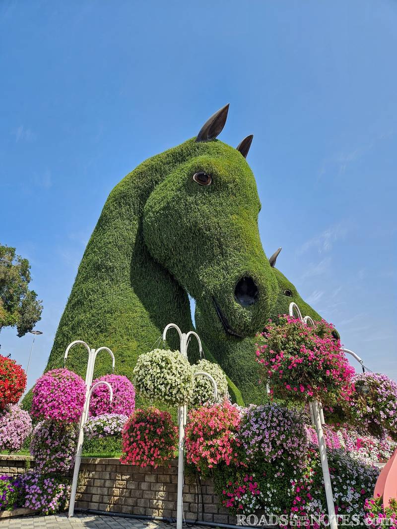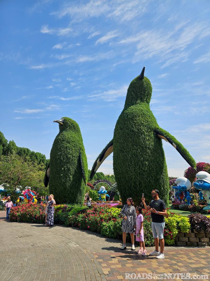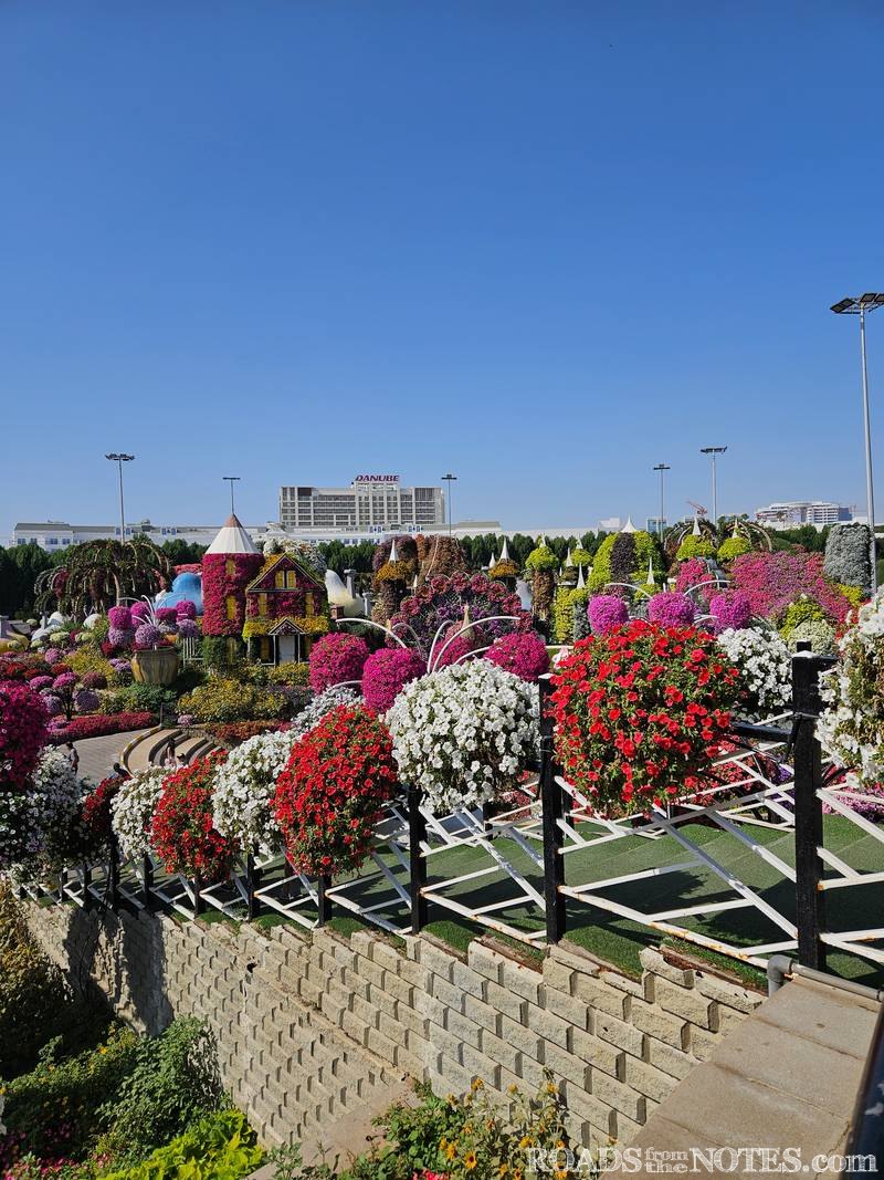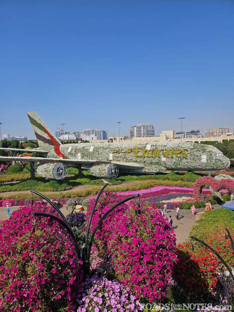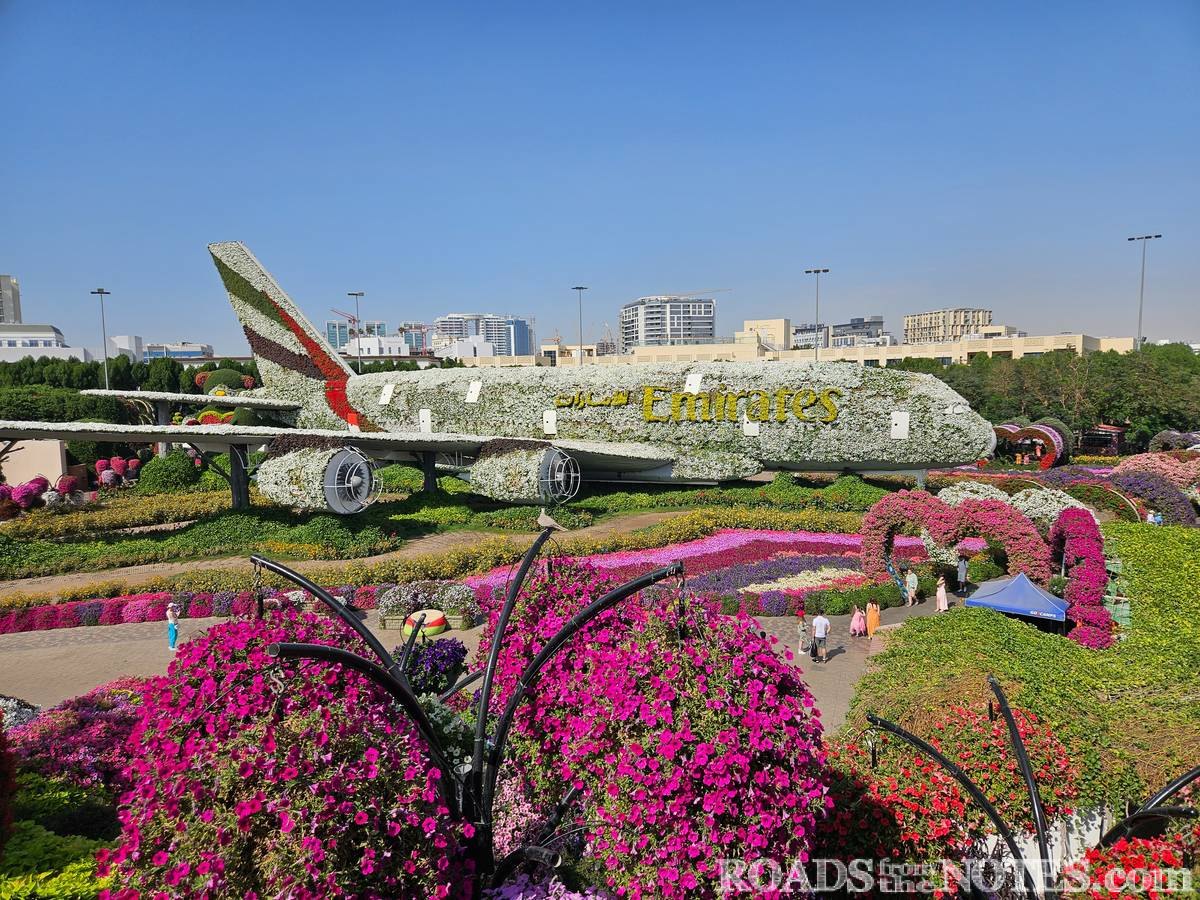 В градините видяхме над 150 милиона цвята, оформени в невероятни фигури – самолети, замъци, сърца, лебеди, анимационни герои и какво ли още не. Най-впечатляваща е инсталацията на самолета Emirates A380, покрит с над 500 000 свежи цветя!