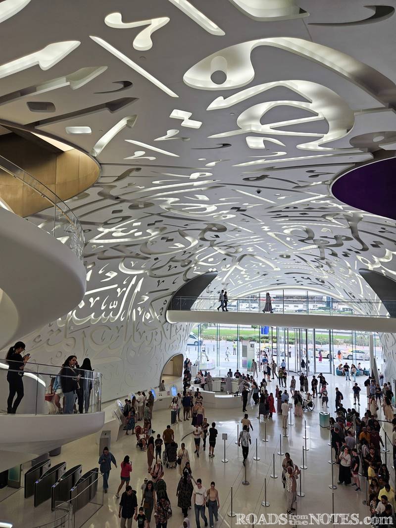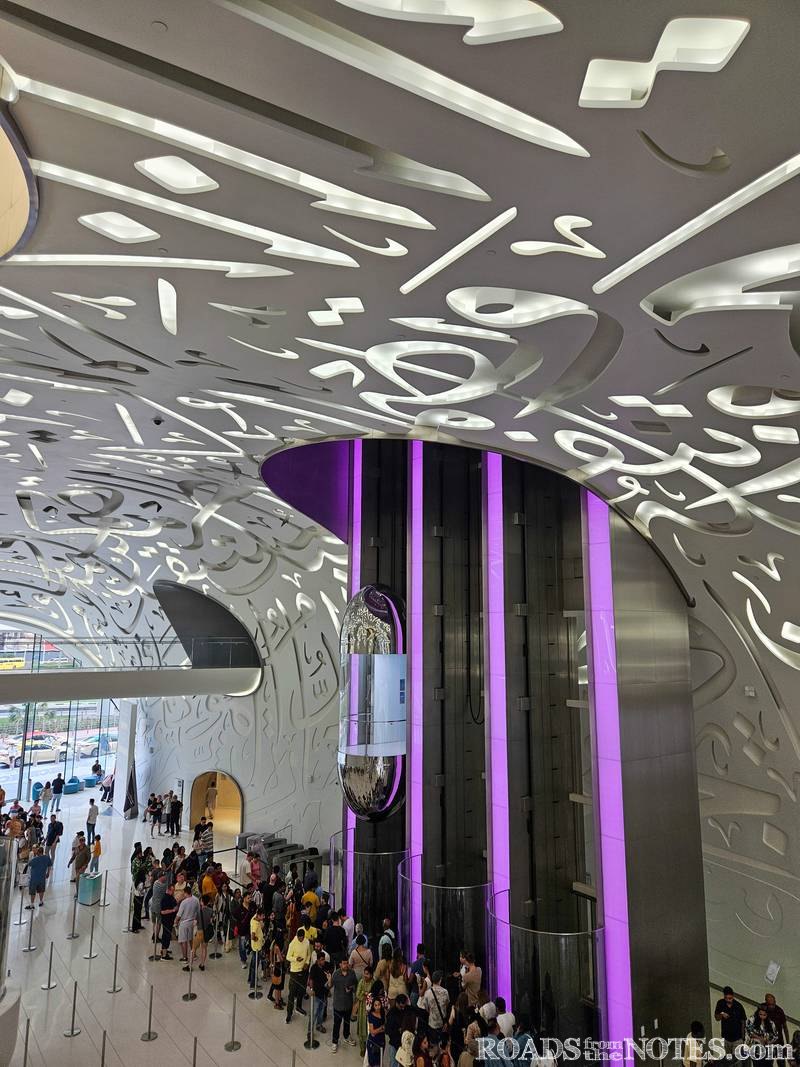 Сградата е истински архитектурен шедьовър – формата ѝ напомня на елипсовиден пръстен или око, отворено към бъдещето. Обвита е в стомана и стъкло, с изрязани арабски калиграфски цитати на министър-председателя на ОАЕ и на Дубай – Шейх Мохамед бин Рашид Ал Мактум. Те всъщност не са само декоративни – през тях прониква естествена светлина, а нощем са осветени по изключително ефектен начин. За любопитните – калиграфията е дело на известния художник Маттар Бин Лахедж.