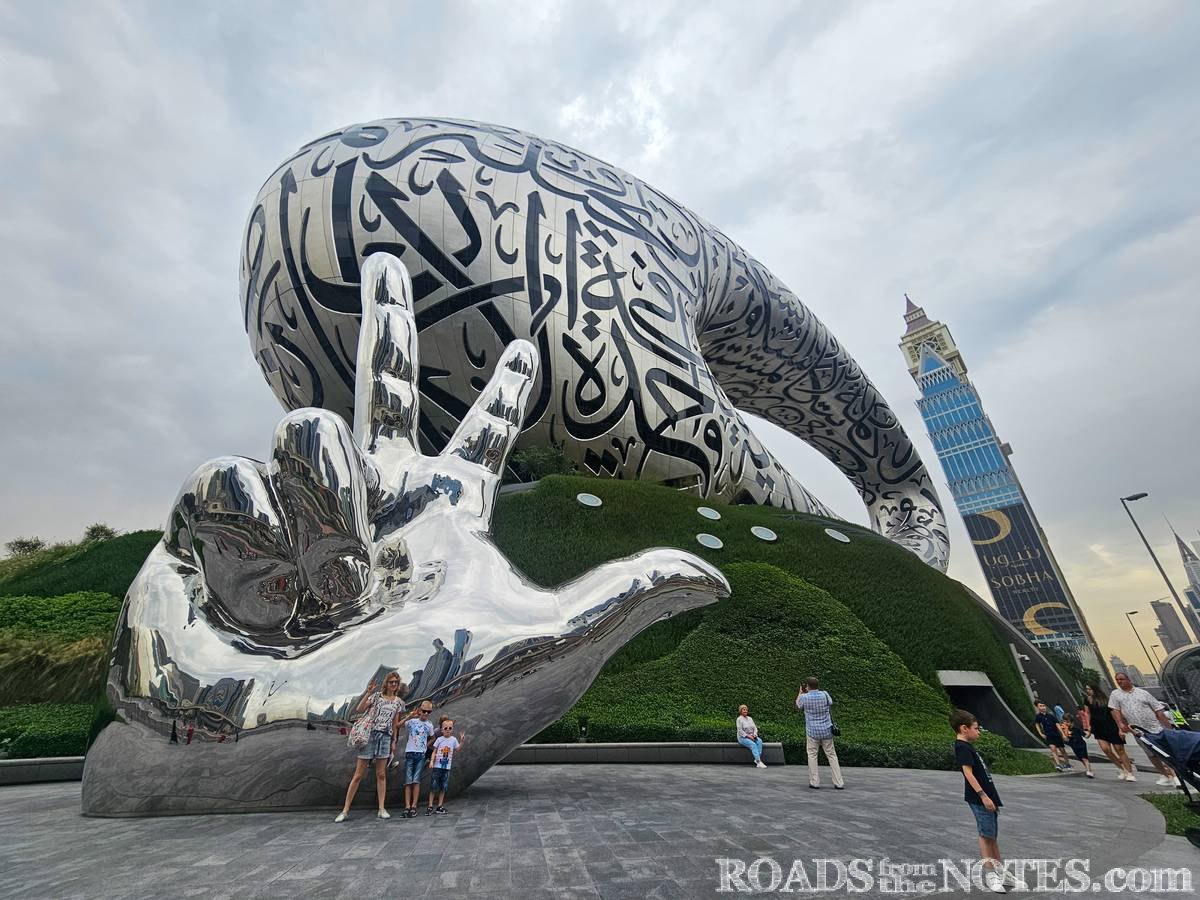 Вторият ни ден в Дубай започна наистина вдъхновяващо – с посещение на Музея на бъдещето (Museum of the Future). Макар и да не разгледахме целия музей, само преддверието беше като излязло от научно-фантастичен филм. Ще започна обаче с нещо, което силно ме впечатли – самата сграда.