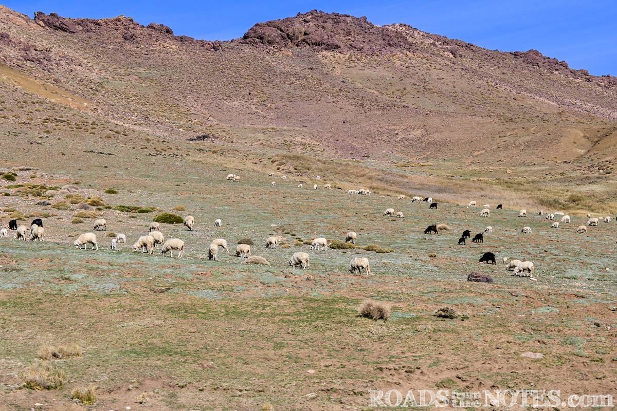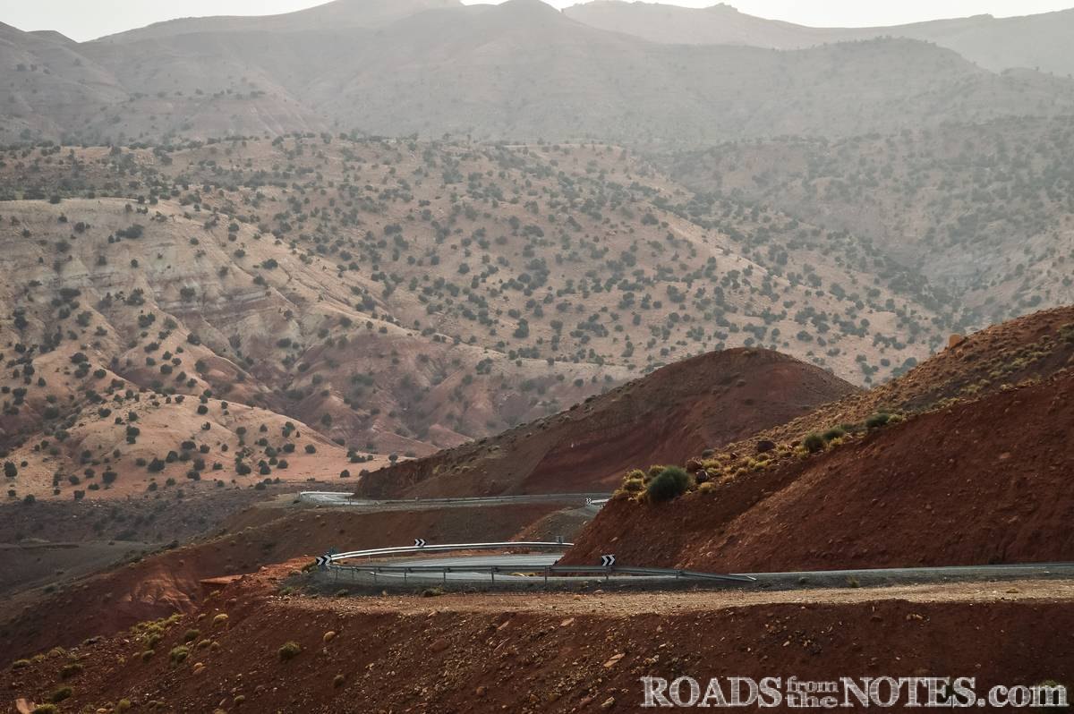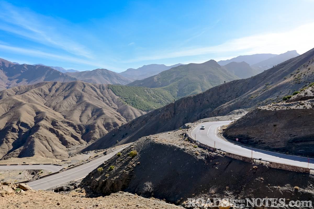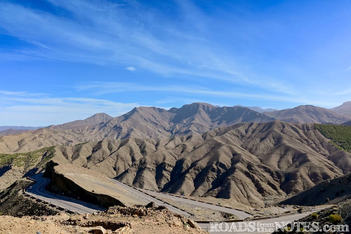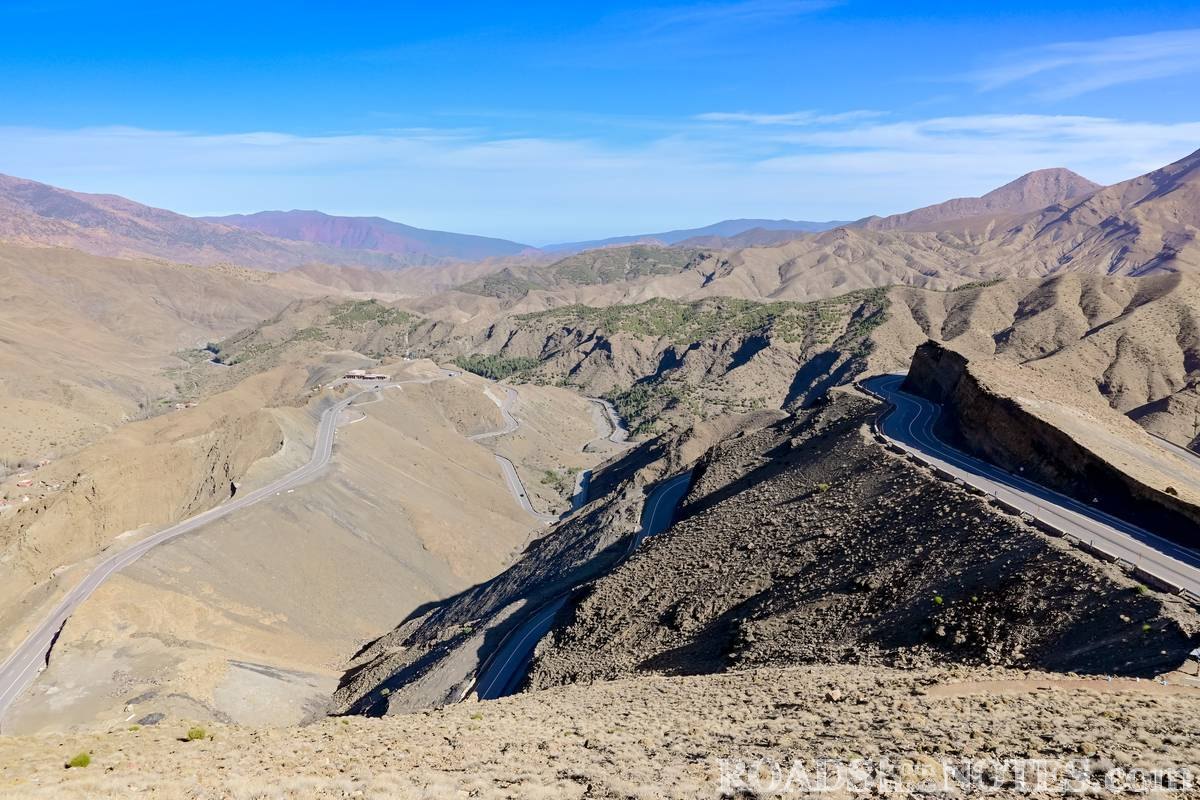 Най-високата точка на прохода достига над 2200 метра височина. Спряхме тук за малко, за да се насладим на мащаба и красотата на Високия Атлас – вълни от набраздени планински ридове, дълбоки долини и тънка лента асфалт, която се вие като змия между тях. Цветовете се менят според светлината – от светли охри и сиви нюанси, до керемидено червено в далечината, контрастиращо силно на синьото небе. Интересно е, че въпреки суровия терен, се забелязват участъци с иглолистни дървета. Тук усещането за простор и тишина е още по-въздействащо, ако си прекарал предишните 3 дни из хаоса на големите градове.