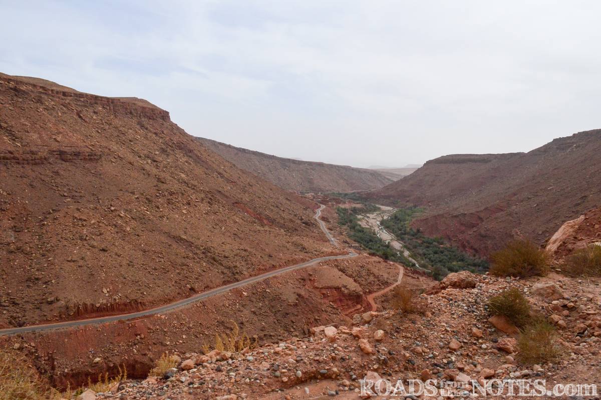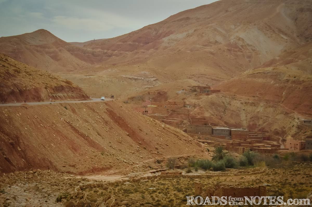 Напуснахме Аит Бенхаду и поехме обратно към Маракеш. Този път вместо да се върнем обратно на юг към главния път N9, продължихме на север по P1506 през Телует (Telouet). Пътят се вие през долината Унила (Ounila), която по-напред се превръща в дълбок каньон. Гледките тук са още по-извънземни – червено-оранжевият марсианси пейзаж е нарушен единствено от оскъдната зеленина на градините в непосредствена близост до коритото на реката. Въпреки суровите условия, тази негостоприемна земя е населена от векове от берберите.